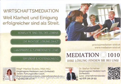 Familienmediation/Scheidungsmediation Rechtsanwalt und Psychotherapeutin bieten gemeinsam Scheidungsmediation/Familienmediatin an.www.familienmediation.at (Rechtsanwalt Dr. Klemens Dallinger und Psychotherapeutin Margarethe Mensdorff-Pouilly)